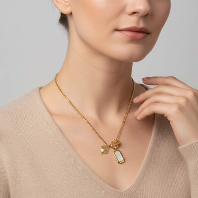 24,00 €Κολιέ με αλυσίδα από ανοξείδωτο ατσάλι σε χρυσό χρώμα, με στοιχεία ανοξείδωτου ατσαλιού, οπάλιο και λευκό σμάλτο. Διαστάσεις 27,5 εκ μήκος. -
