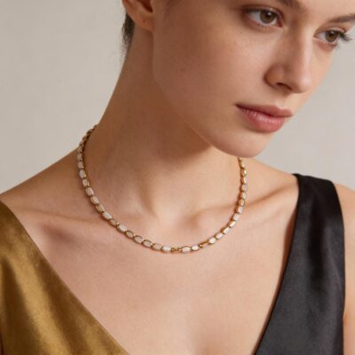 26,00 €Κολιέ με αλυσίδα από ανοξείδωτο ατσάλι σε στυλ γραβάτας, χρυσό χρώμα, με στοιχεία ανοξείδωτου ατσαλιού. Διαστάσεις 50 εκ + 6 εκ επέκταση. -