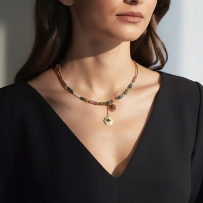 35,00 €Κολιέ από ανοξείδωτο ατσάλι χρυσό, με αχάτη Indian σε σχήμα παραλληλόγραμμου, γήινα χρώματα και ροδέλες αιματίτη χρυσές. Στοιχεία ατσάλινα, πράσινο σμάλτο και αμέθυστος. Διαστάσεις 44,5 εκ αυξομείωση. -