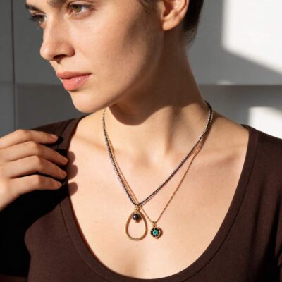 29,00 €Τρίσειρο κολιέ με αλυσίδες από ανοξείδωτο ατσάλι και ορείχαλκο. Στοιχεία από ατσάλι, σμάλτο και μαργαριτάρι blue black γλυκού νερού. Διαστάσεις 43 εκ + 5 εκ αυξομείωση. -