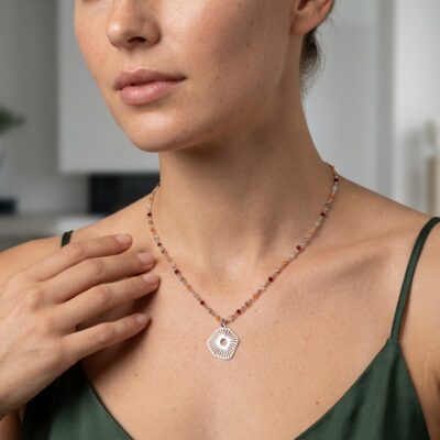 18,00 €Κολιέ ροζάριο από ανοξείδωτο ατσάλι, ασημί χρώμα με γήινες αποχρώσεις καφέ και μπορντώ. Κεντρικό στοιχείο ατσάλινο μοτίφ φιλιγκρί ασημί. Διαστάσεις 47 εκ + 5,5 εκ επέκταση. -