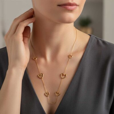 20,00 €Κολιέ με αλυσίδα snake από ανοξείδωτο ατσάλι χρυσό, στοιχεία περιγράμματα από μικρές και μεγάλες καρδιές. Διαστάσεις 84 εκ + 6 εκ επέκταση. -